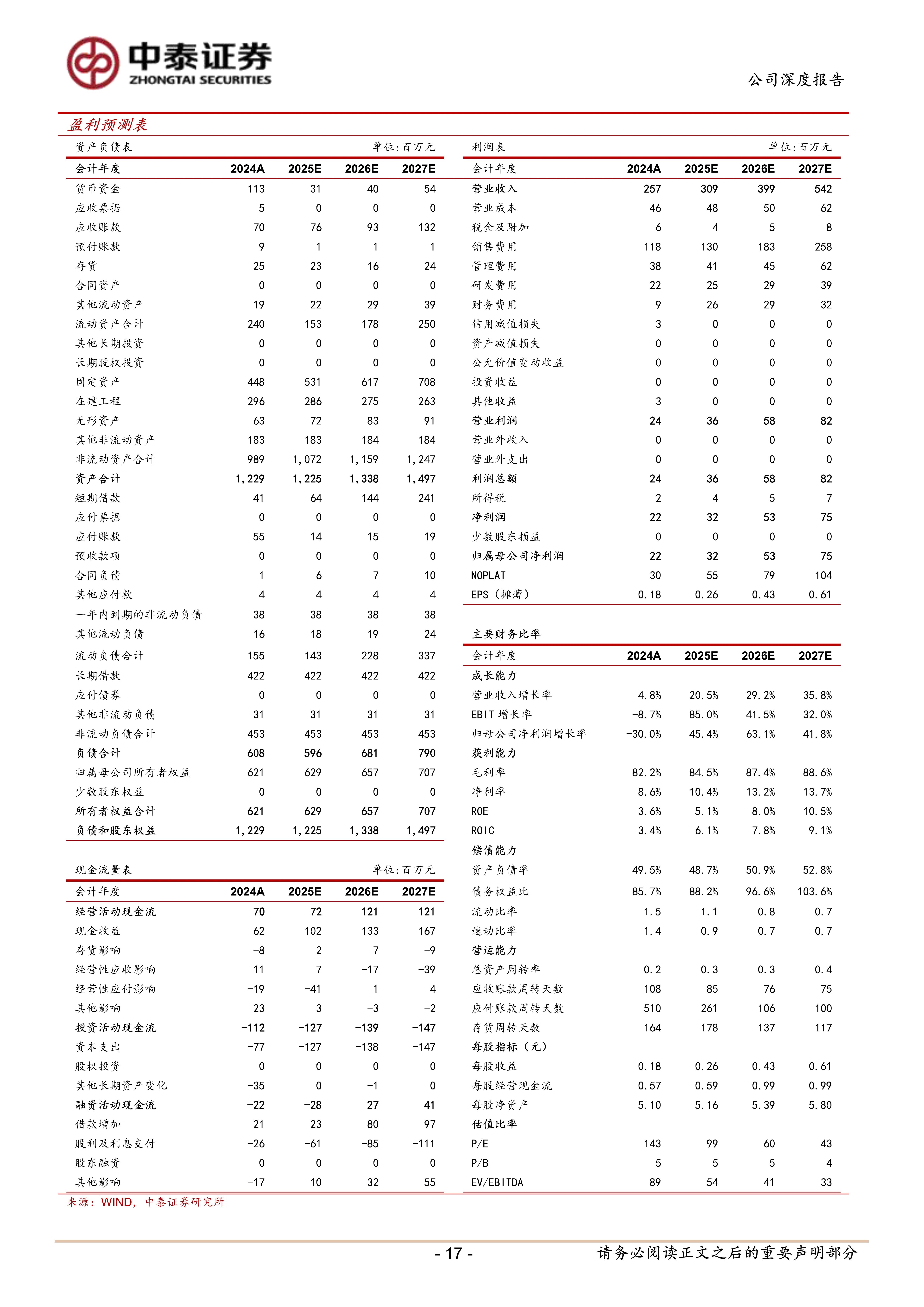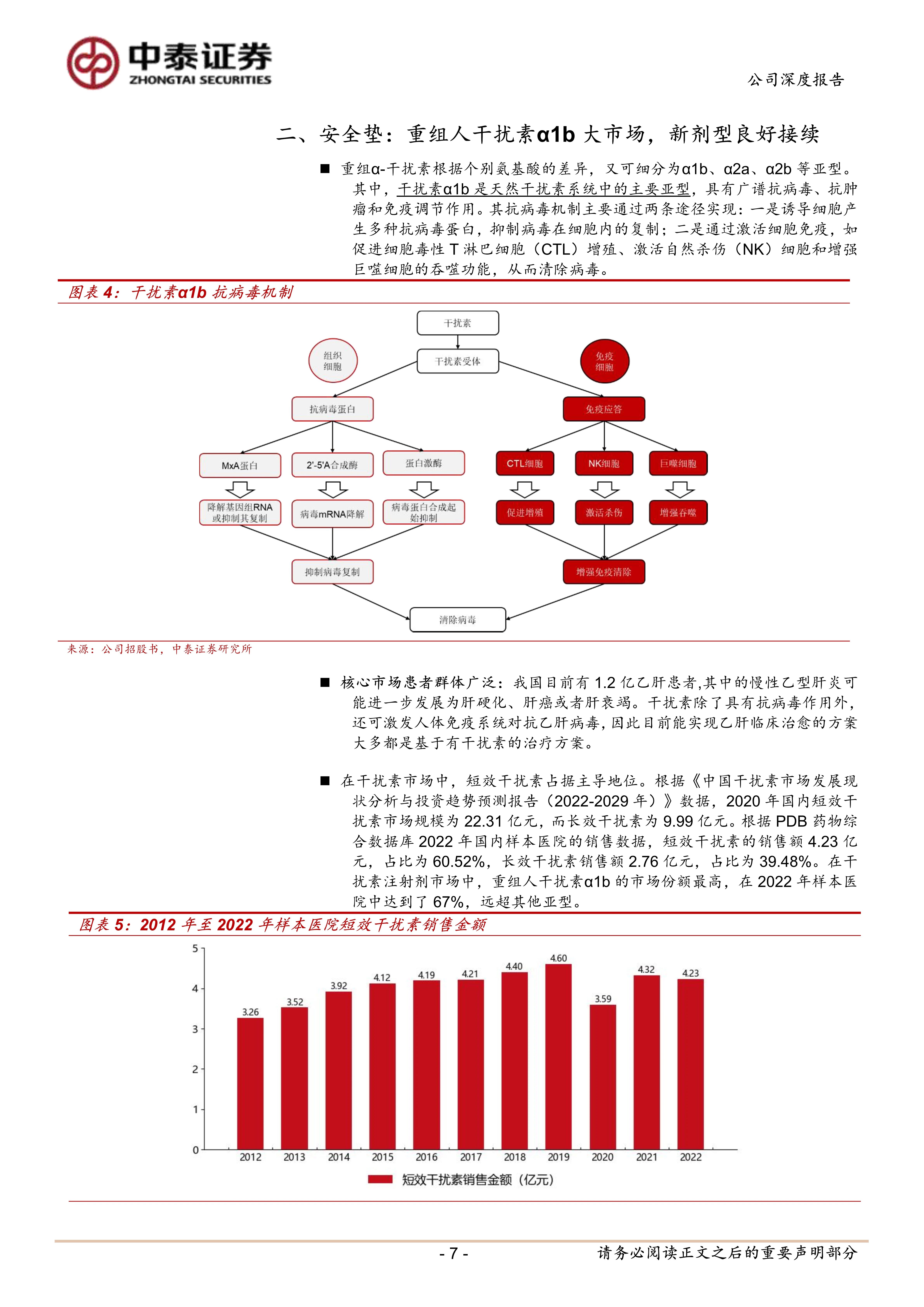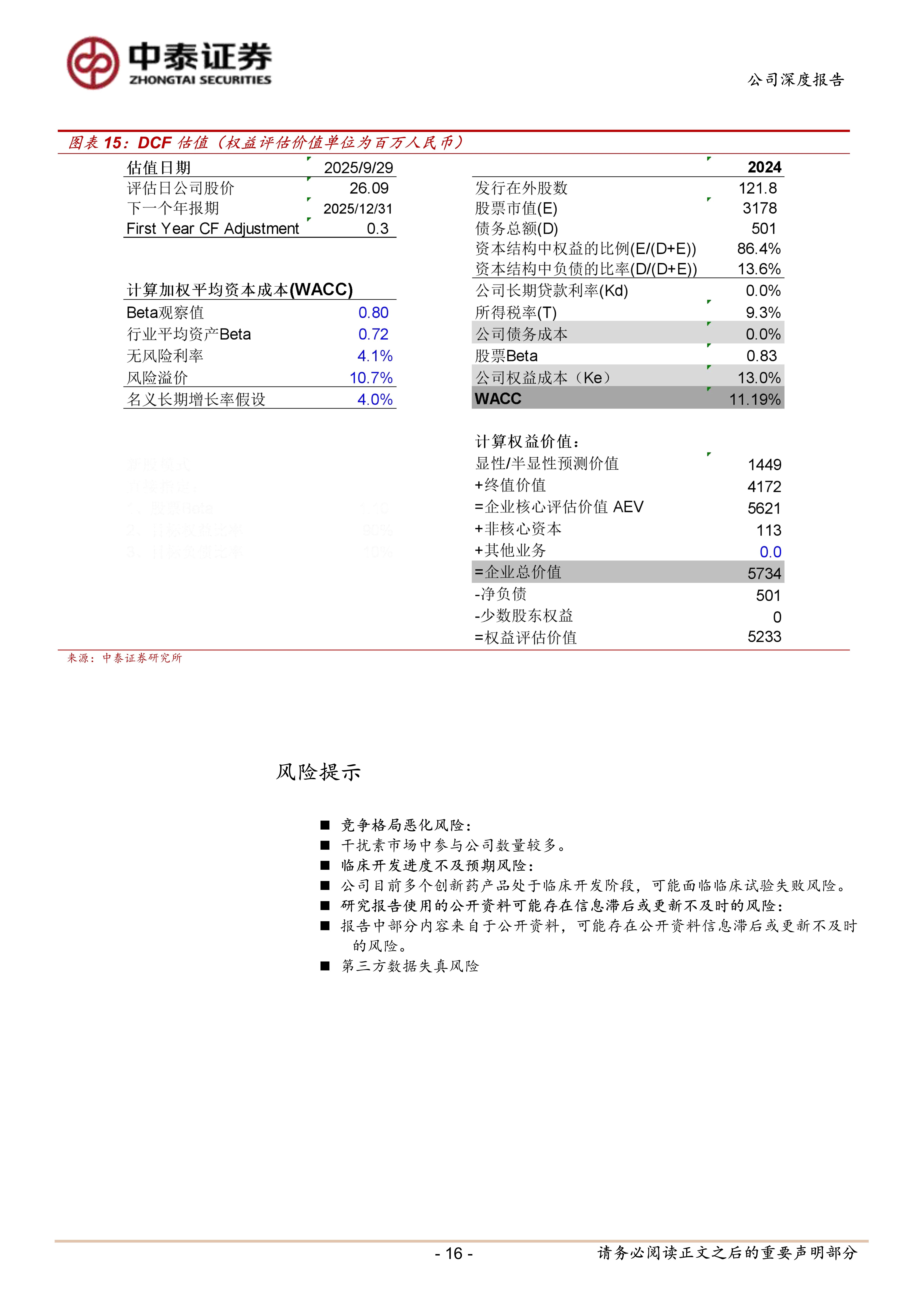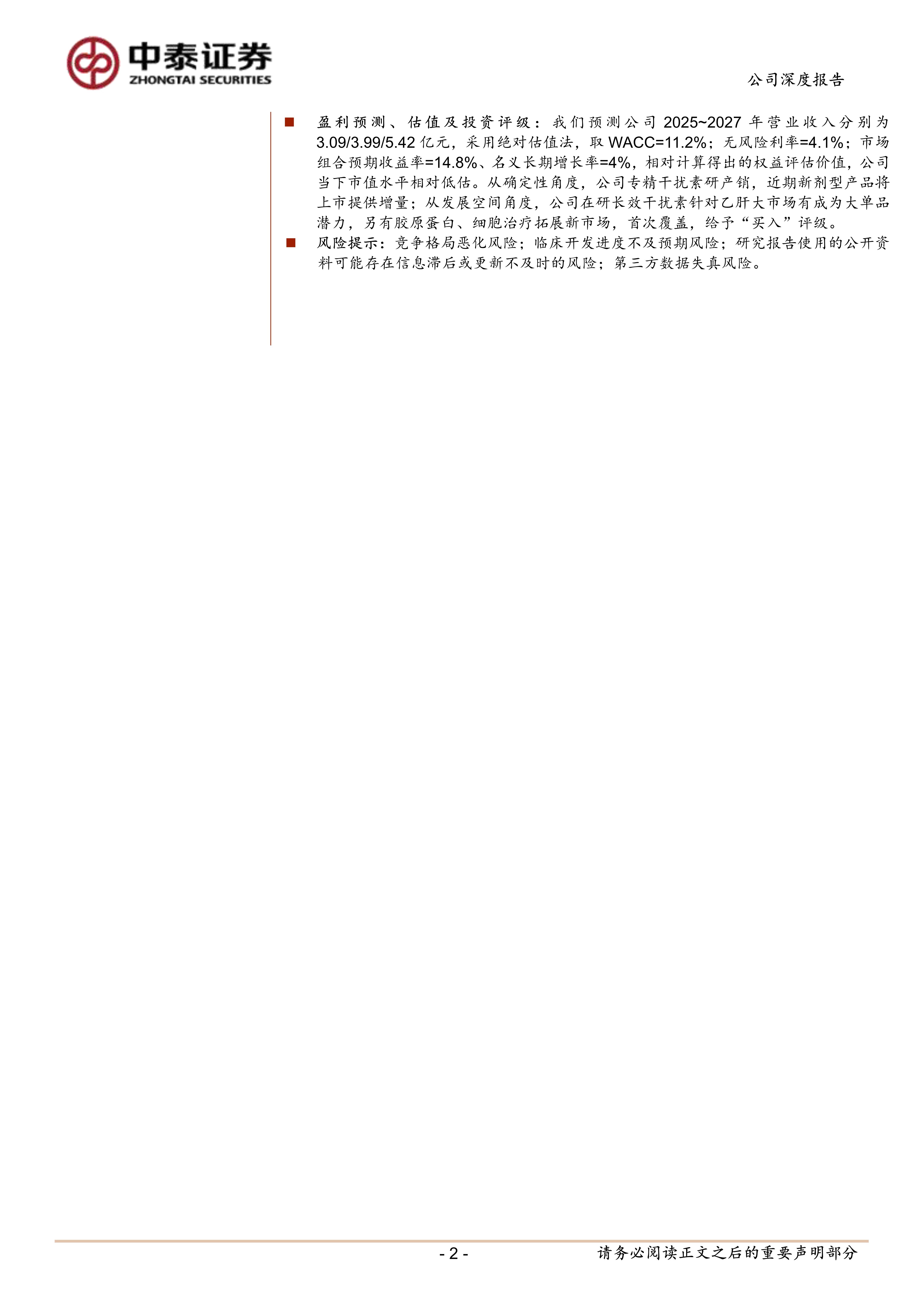 盈利预测、估值及投资评级:我们预测公司2025~2027年营业收入分别为3.09/3.99/5.42亿元,采用绝对估值法,取WACC=11.2%;无风险利率=4.1%;市场组合预期收益率=14.8%、名义长期增长率=4%,相对计算得出的权益评估价值,公司当下市值水平相对低估。从确定性角度,公司专精干扰素研产销,近期新剂型产品将上市提供增量;从发展空间角度,公司在研长效干扰素针对乙肝大市场有成为大单品潜力,另有胶原蛋白、细胞治疗拓展新市场,首次覆盖,给予“买入”评级。