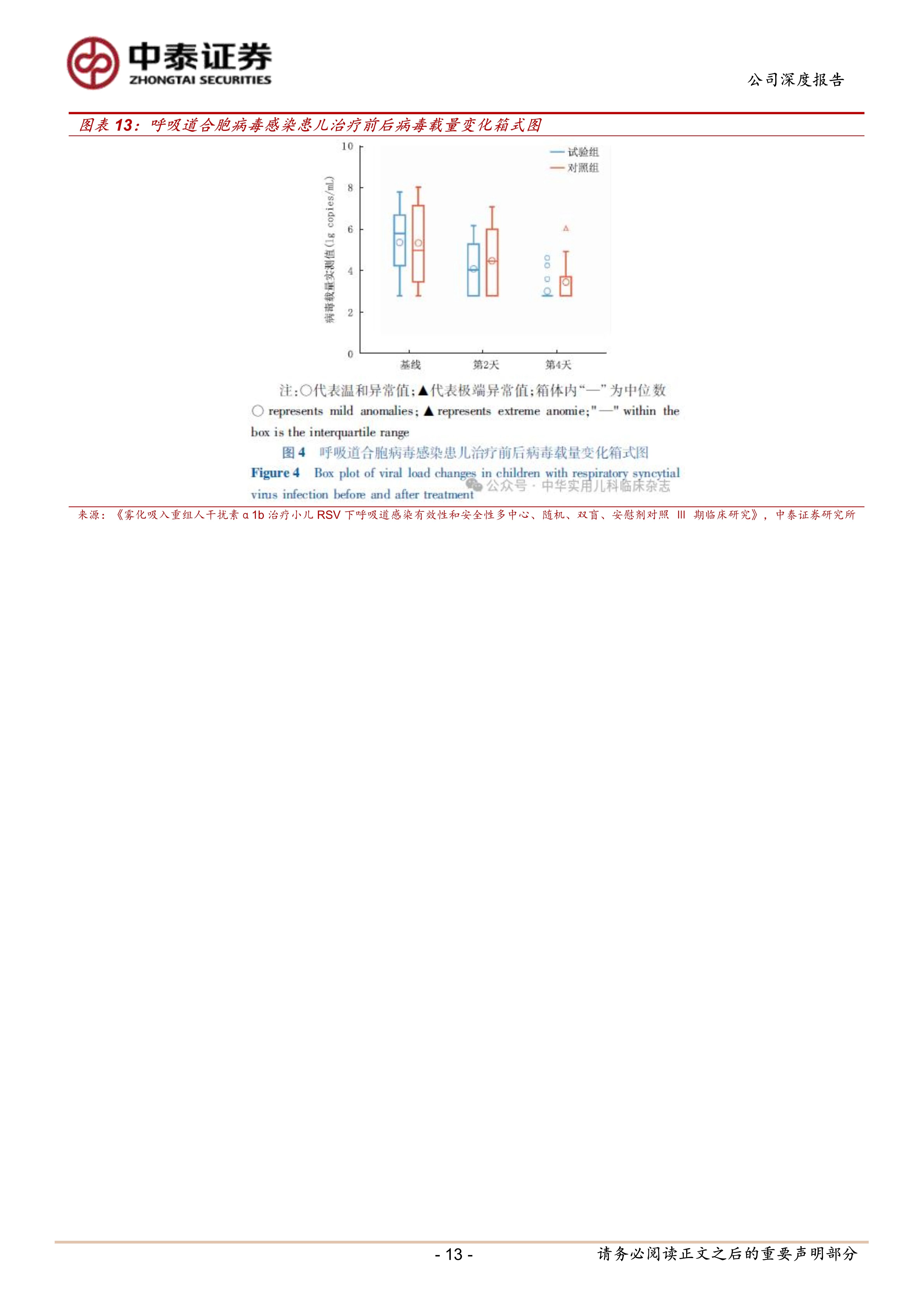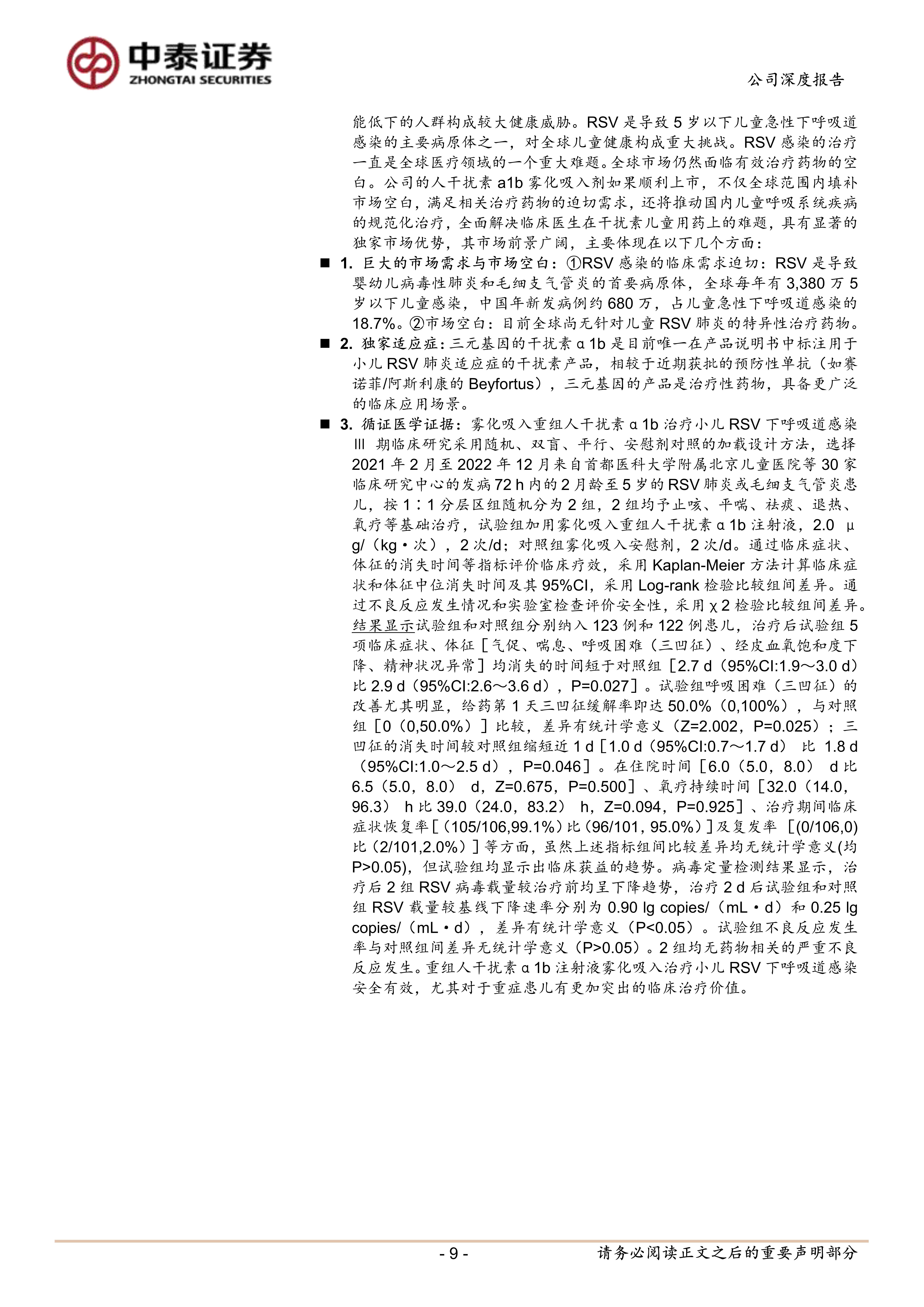 安全垫:重组人干扰素α1b大市场,新剂型良好接续。公司通过建立重组蛋白高稳定性水溶液技术平台,成功开发了干扰素等细胞因子药物的水针剂、喷雾剂、滴眼液、预充式注射剂、卡式笔多剂量注射剂、微针、雾化吸入剂等产品。已上市的运德素®传统剂型放量良好,在研核心产品人干扰素α1b雾化吸入剂针对小儿呼吸道合胞病毒(RSV)肺炎上市在即,市场潜力巨大。该药物若获批,将成为国内首个RSV雾化治疗药物,填补市场空白。