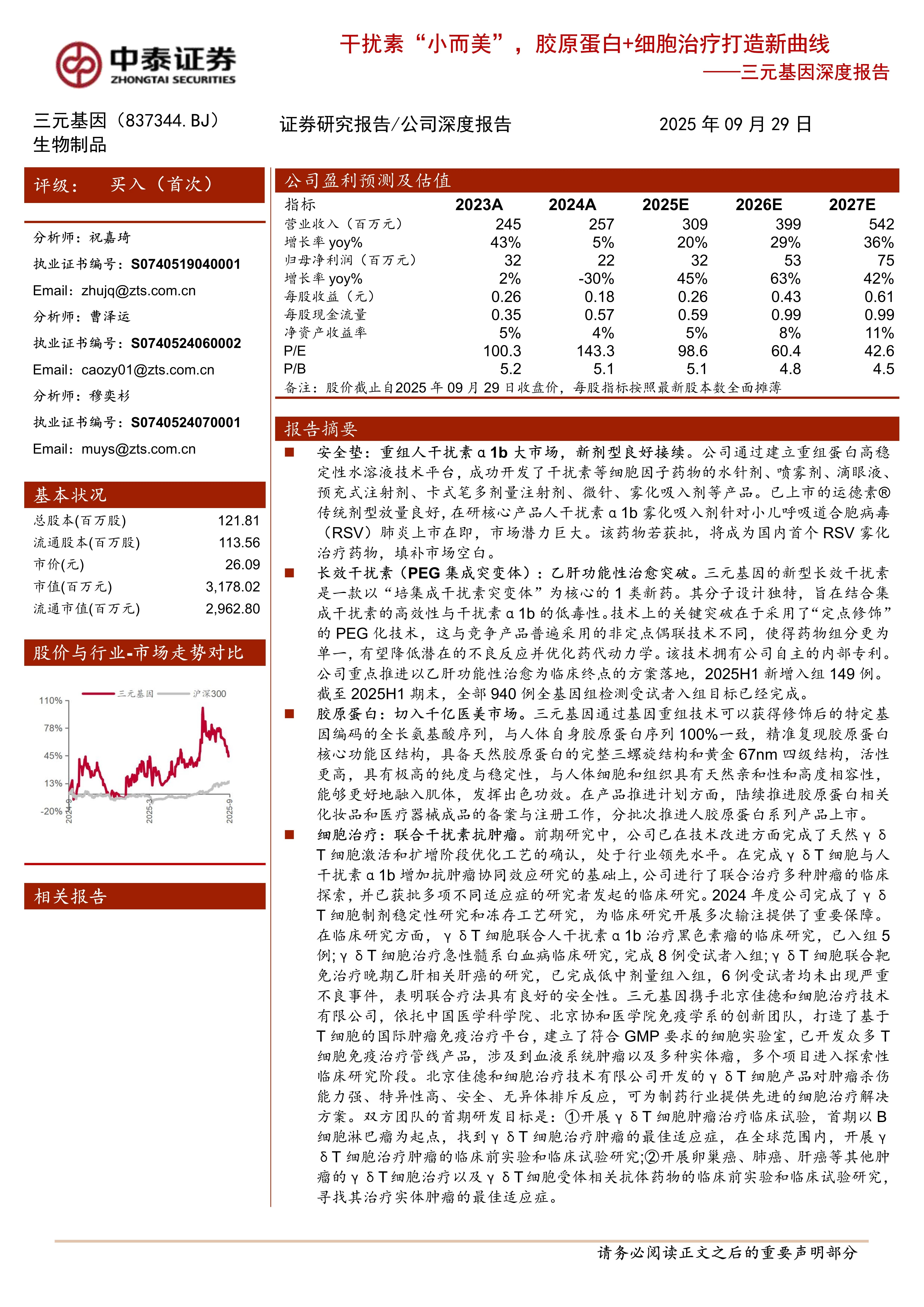 细胞治疗:联合干扰素抗肿瘤。前期研究中,公司已在技术改进方面完成了天然γδT细胞激活和扩增阶段优化工艺的确认,处于行业领先水平。在完成γδT细胞与人干扰素α1b增加抗肿瘤协同效应研究的基础上,公司进行了联合治疗多种肿瘤的临床探索,并已获批多项不同适应症的研究者发起的临床研究。2024年度公司完成了γδT细胞制剂稳定性研究和冻存工艺研究,为临床研究开展多次输注提供了重要保障。在临床研究方面,γδT细胞联合人干扰素α1b治疗黑色素瘤的临床研究,已入组5例;γδT细胞治疗急性髓系白血病临床研究,完成8例受试者入组;γδT细胞联合靶免治疗晚期乙肝相关肝癌的研究,已完成低中剂量组入组,6例受试者均未出现严重不良事件,表明联合疗法具有良好的安全性。三元基因携手北京佳德和细胞治疗技术有限公司,依托中国医学科学院、北京协和医学院免疫学系的创新团队,打造了基于T细胞的国际肿瘤免疫治疗平台,建立了符合GMP要求的细胞实验室,已开发众多T细胞免疫治疗管线产品,涉及到血液系统肿瘤以及多种实体瘤,多个项目进入探索性临床研究阶段。北京佳德和细胞治疗技术有限公司开发的γδT细胞产品对肿瘤杀伤能力强、特异性高、安全、无异体排斥反应,可为制药行业提供先进的细胞治疗解决方案。双方团队的首期研发目标是:①开展γδT细胞肿瘤治疗临床试验,首期以B细胞淋巴瘤为起点,找到γδT细胞治疗肿瘤的最佳适应症,在全球范围内,开展γδT细胞治疗肿瘤的临床前实验和临床试验研究;②开展卵巢癌、肺癌、肝癌等其他肿瘤的γδT细胞治疗以及γδT细胞受体相关抗体药物的临床前实验和临床试验研究,寻找其治疗实体肿瘤的最佳适应症。